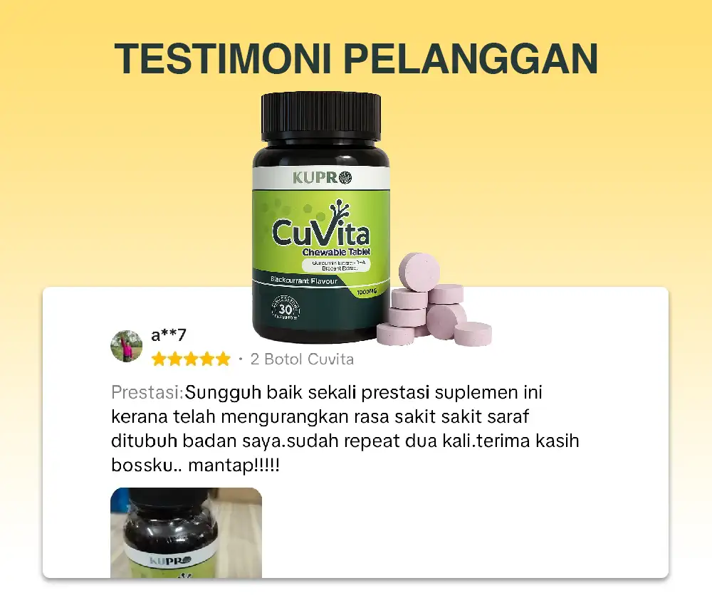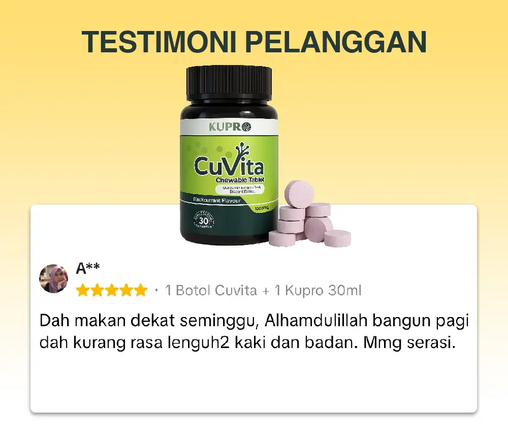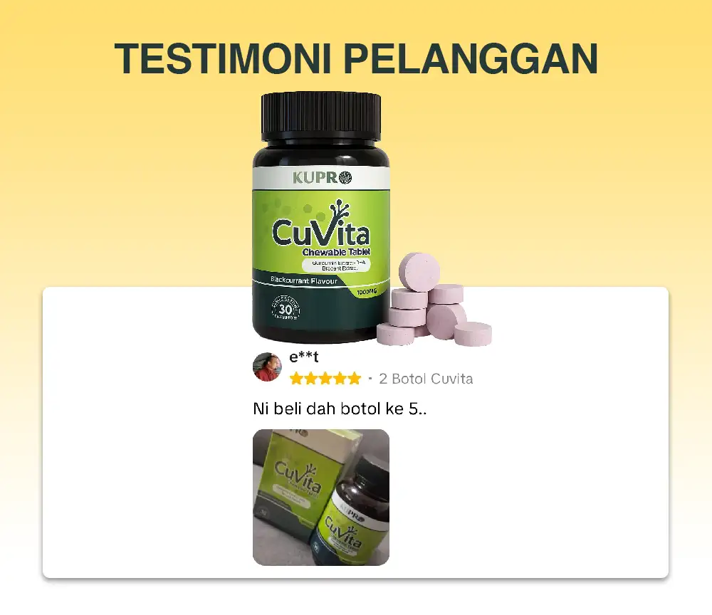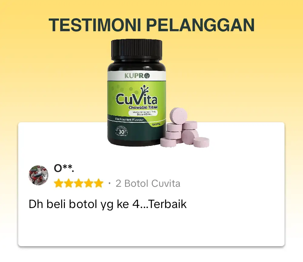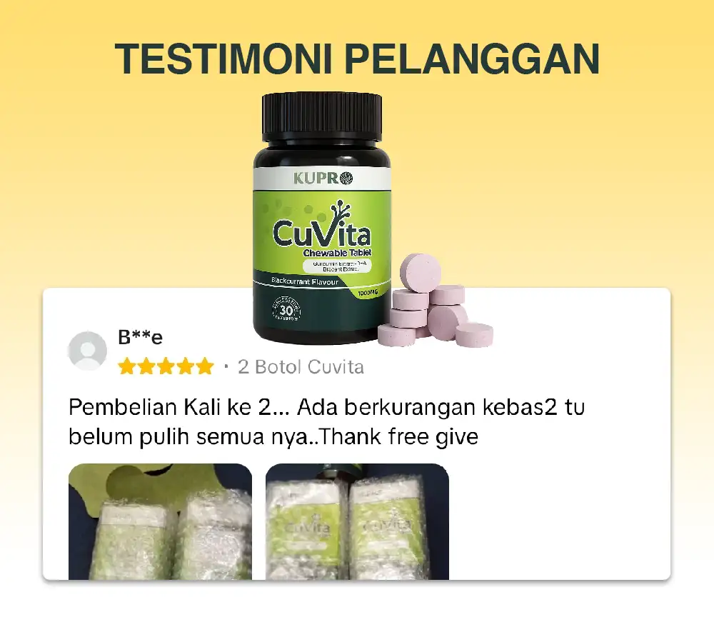 Sebab itu, kami bagi jaminan. Takde siapa pun rugi untuk cuba produk LOSYEN KUPRO & Cuvita. Cubalah produk ni sekarang. Sekiranya… selepas dah amalkan selama 3 bulan. Kalau tak suka dengan kesan. Rasa tak Sedap. Tak suka bau. Tak suka texture. Pulangkan balik.